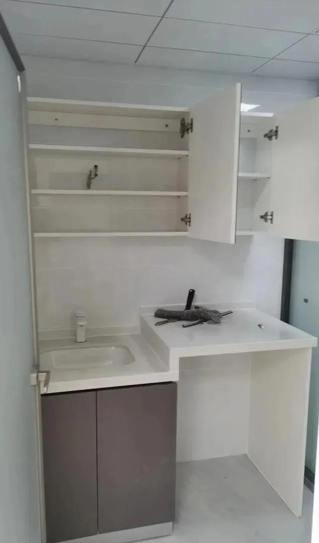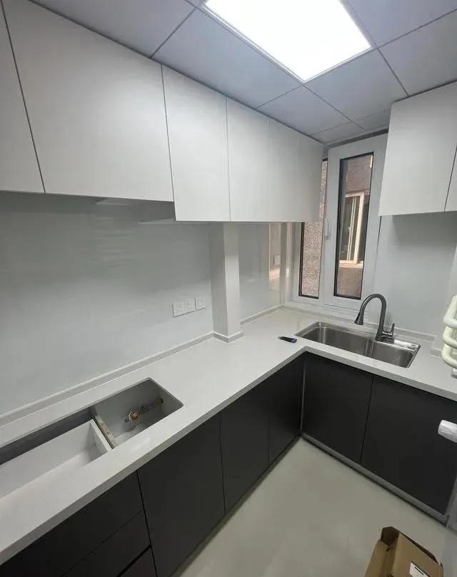 这是厨房。对于这样的户型而言,其实这样的户型面积还算可以。根据厨房结构定制了橱柜,其布局形成了 “洗、切、炒” 的顺序,操作起来特别方便。墙上的吊柜为白色,看起来十分干净。