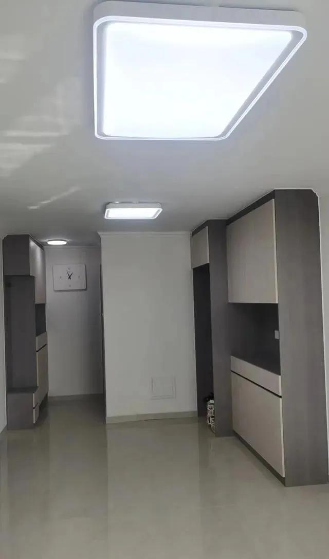 客厅与餐厅处于同一空间,可以看到餐厅面积虽小,但旁边的餐边柜却是不可或缺的一部分。在设计餐边柜时,预留了放置冰箱的位置,这一点相当不错。若要将冰箱放置在餐边柜旁,需提前了解冰箱的具体尺寸,这点确实非常重要。届时,餐桌可选择布置一张方形餐桌,会比较合理。顶面未安装吊顶,毕竟层高条件不太适合做吊顶。同时,考虑到这一情况,安装了吸顶灯,非常合适。